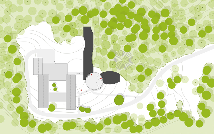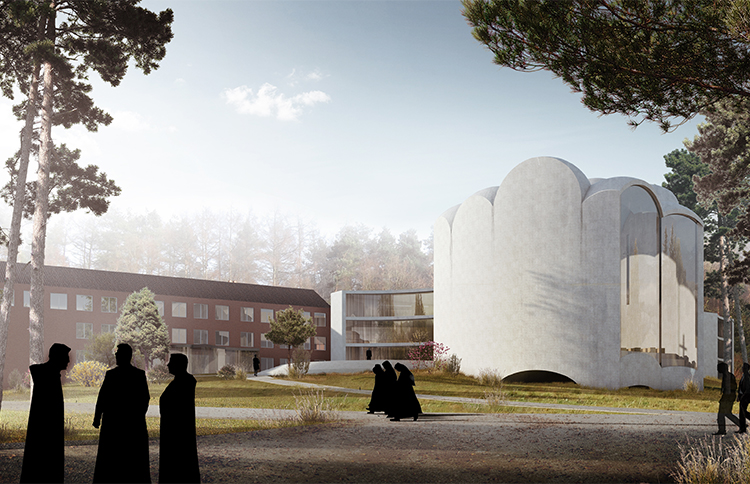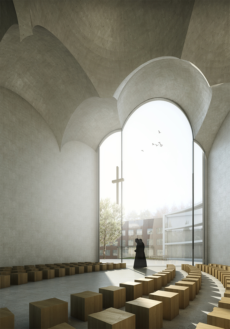 Das neue Klostergebäude wird den Masterplan von 1968 in einem neuen baulichen Umfang vervollständigen. Im Kontext mit den bestehenden Gebäuden, die als Gästehaus funktionieren, werden die beiden neuen Bauten dem Kloster die fehlende Adresse und Identität verleihen. Mit Erreichen der grossen Lichtung am Wald definieren der Konventsbau und die Kapelle einen „Kirchplatz“, der als Treffpunkt begrüsst und lenkt. Die Kapelle positioniert sich an der Schnittstelle zwischen
