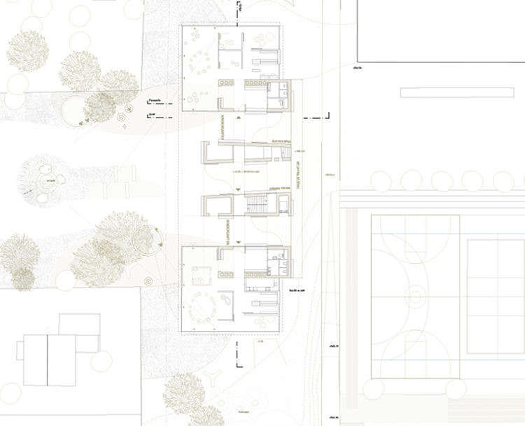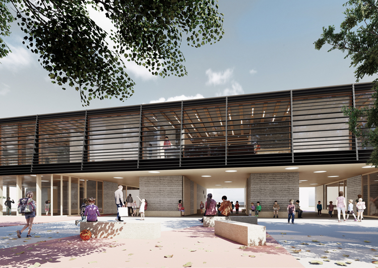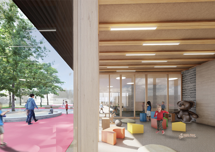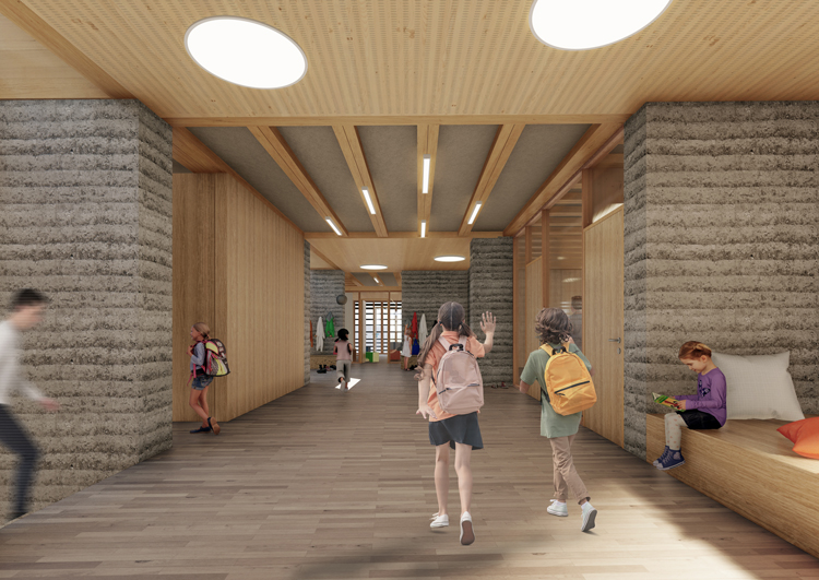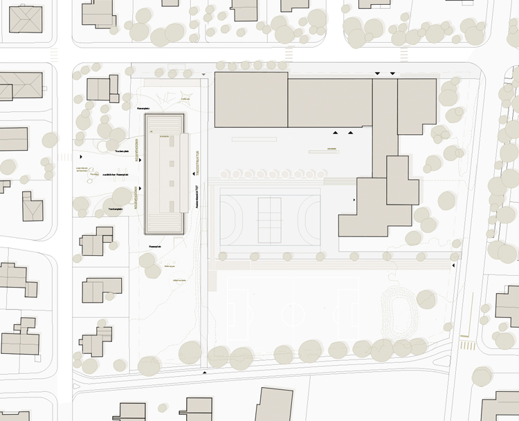 Die beiden transparenten Kindergartenbereich verschränken sich mit dem westlichen Aussenraum Die eingeschriebenen Erdkuben formen einen individuellen Eingang und Adresse zu beiden Kindergärten, sowie den Tagesstrukturen. Die beiden mittleren Lehmkuben orientieren das Obergeschoss zur Primarschule. Ehemals in Beton konstruierte transparenten Erdgeschossbereiche werden durch eine Holzkonstruktion und eine Holz Lehmdecke zeitgemäss, materialbewusst neu gedacht.